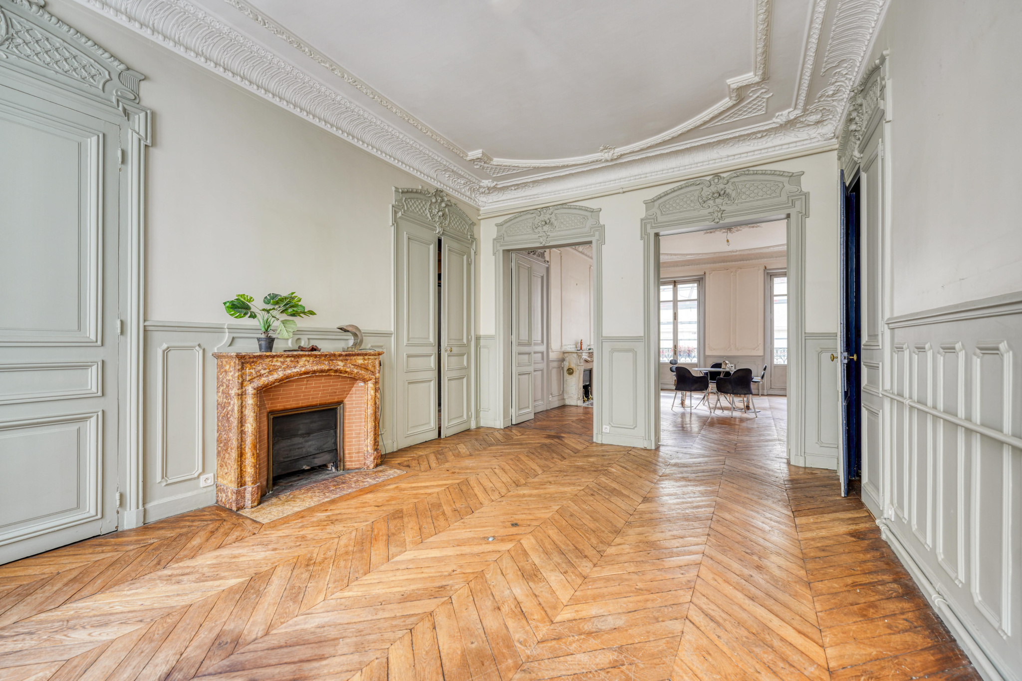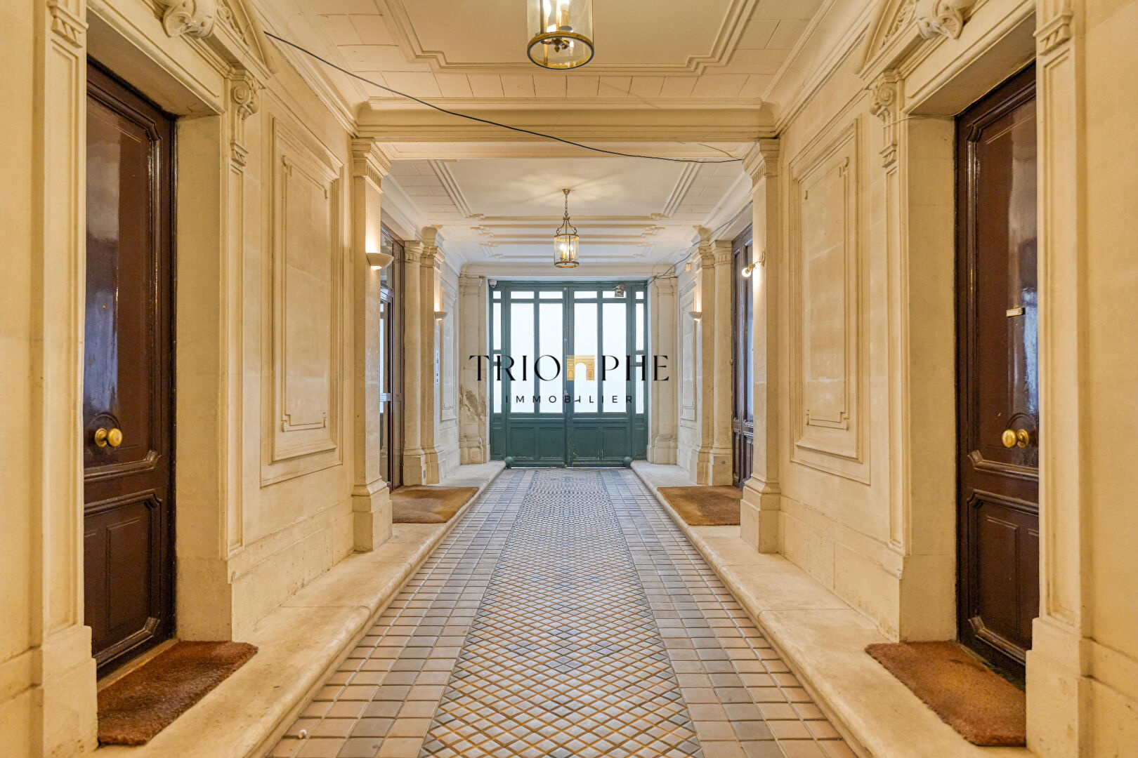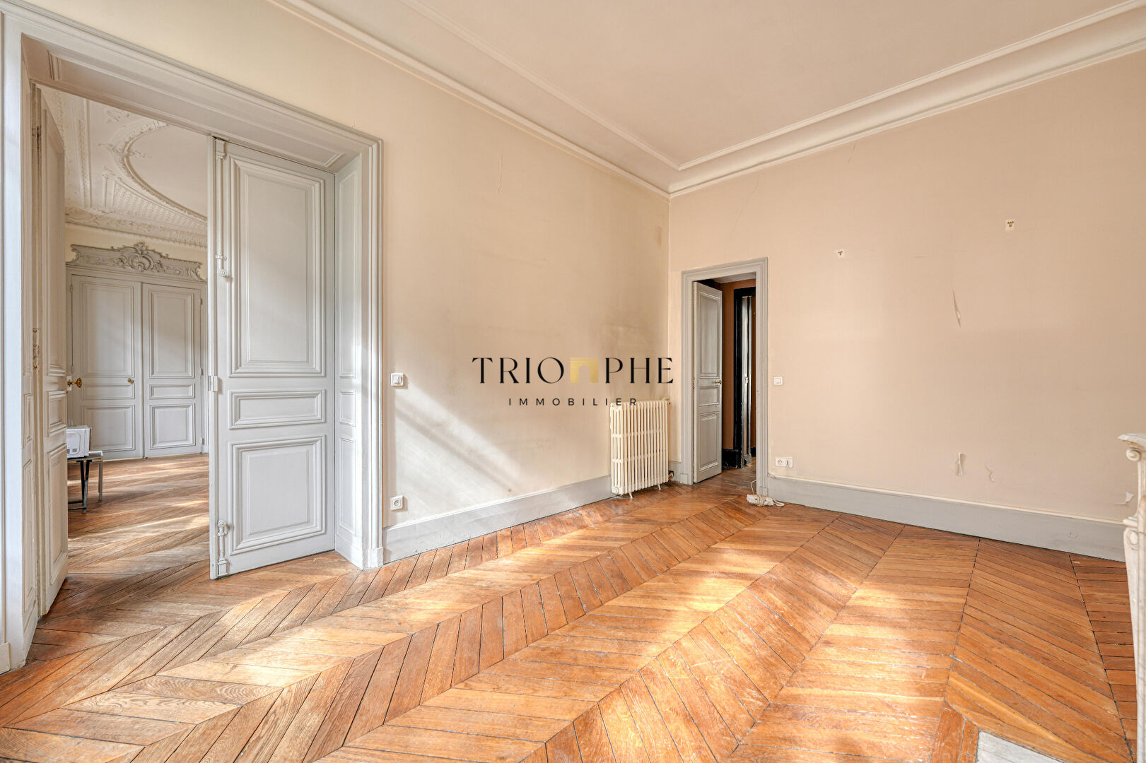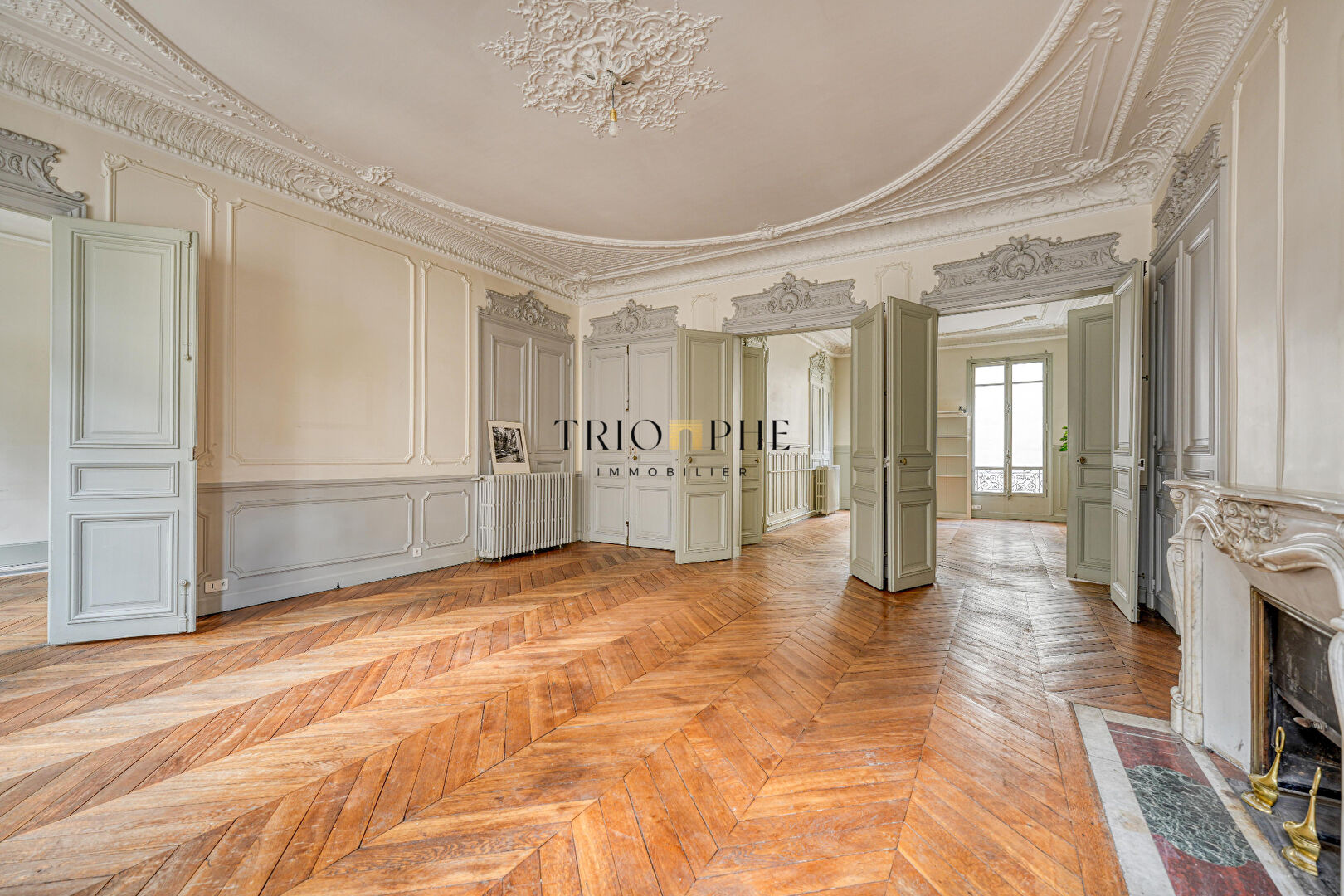 À deux pas de la place de l'Étoile, dans un immeuble de charme ancien, Triomphe immobilier à le plaisir de vous faire découvrir ce magnifique appartement familial de 167,26 m2 (loi Carrez), situé au 3ème étage avec ascenseur sans voisins de palier. Ce bien rare séduit par son cachet authentique : moulures d'époque, parquet d'origine, une très grande hauteur sous plafond de 3,30 m et des volumes généreux L'entrée, en étoile, dessert un vaste double séjour en enfilade baigné de lumière, ainsi que deux des trois chambres de l'appartement, dont une suite parentale. L'espace nuit se complète par une grande salle de bains avec baignoire, douche, et WC, ainsi qu'un WC séparé. La cuisine, spacieuse et située à l'extrémité de l'appartement, offre un beau potentiel d'aménagement pour les amateurs de convivialité. En complément, au 6ème étage (sans ascenseur qui s'arrête au 5e etage), une studette avec douche, kitchenette, et vue dégagée sur la Tour Eiffel et l'Arc de Triomphe. Trois caves viennent parfaire ce bien rare.