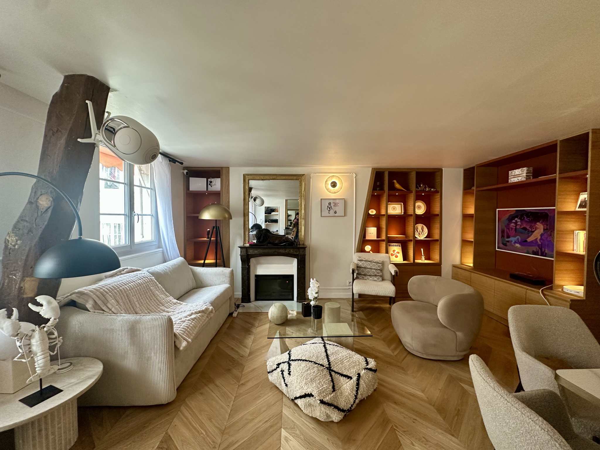 L’appartement, baigné de lumière et traversant, s’ouvre sur une belle pièce de vie de 37 m2 avec cuisine ouverte sur séjour, îlot central convivial et deux cheminées d’époque transformées en éléments de chauffage discret. Un espace parfaitement pensé alliant cachet de l’ancien et confort contemporain.