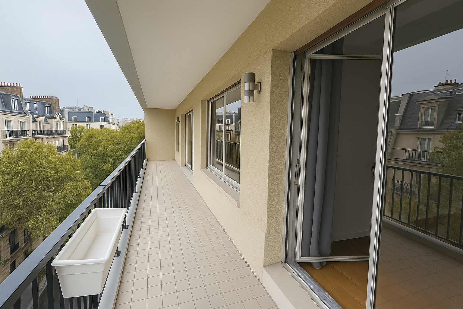 Le bien se compose d'un vaste séjour traversant avec parquet, baigné de lumière grâce à ses grandes baies vitrées donnant sur un balcon filant offrant une vue dégagée sur les toits parisiens.
