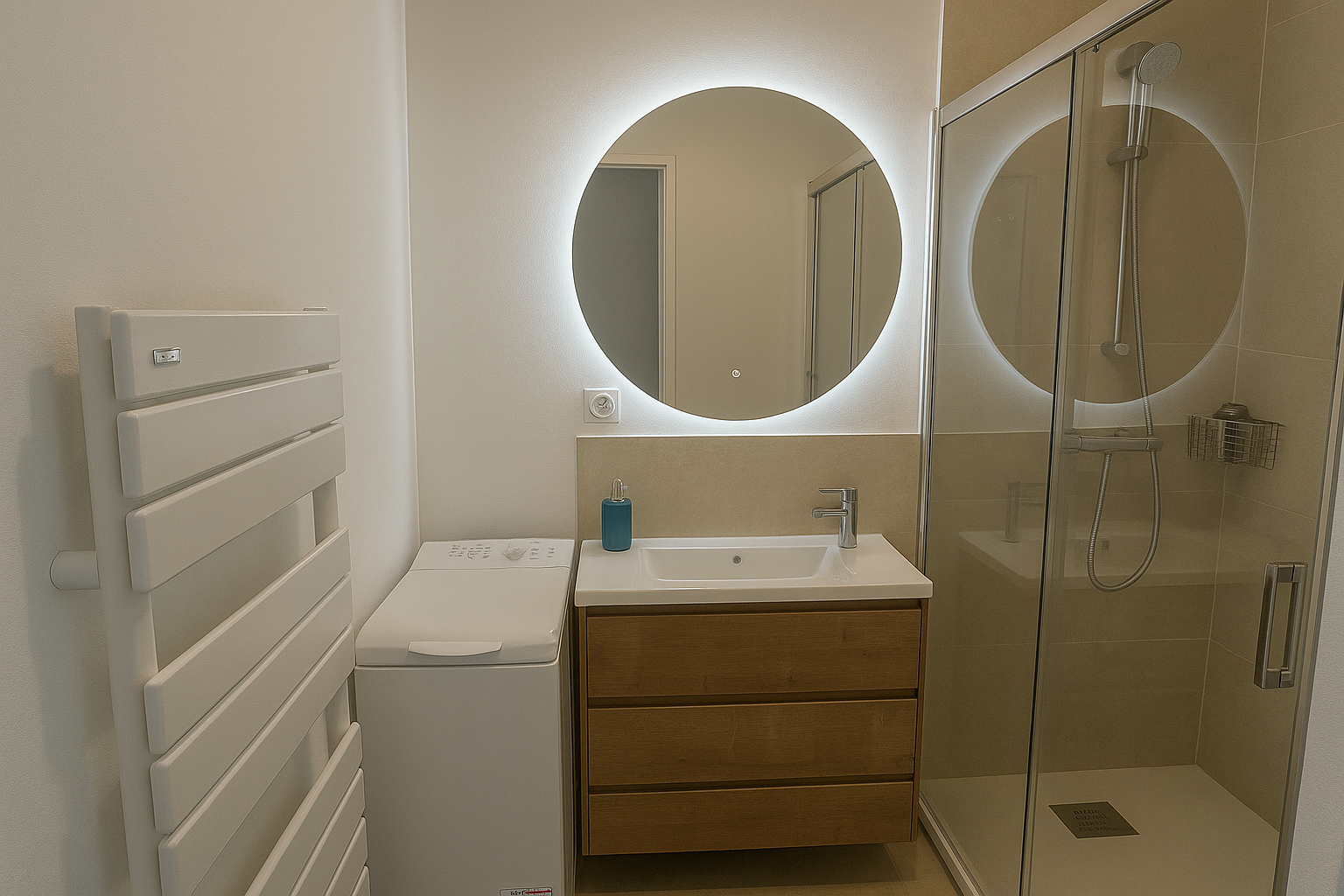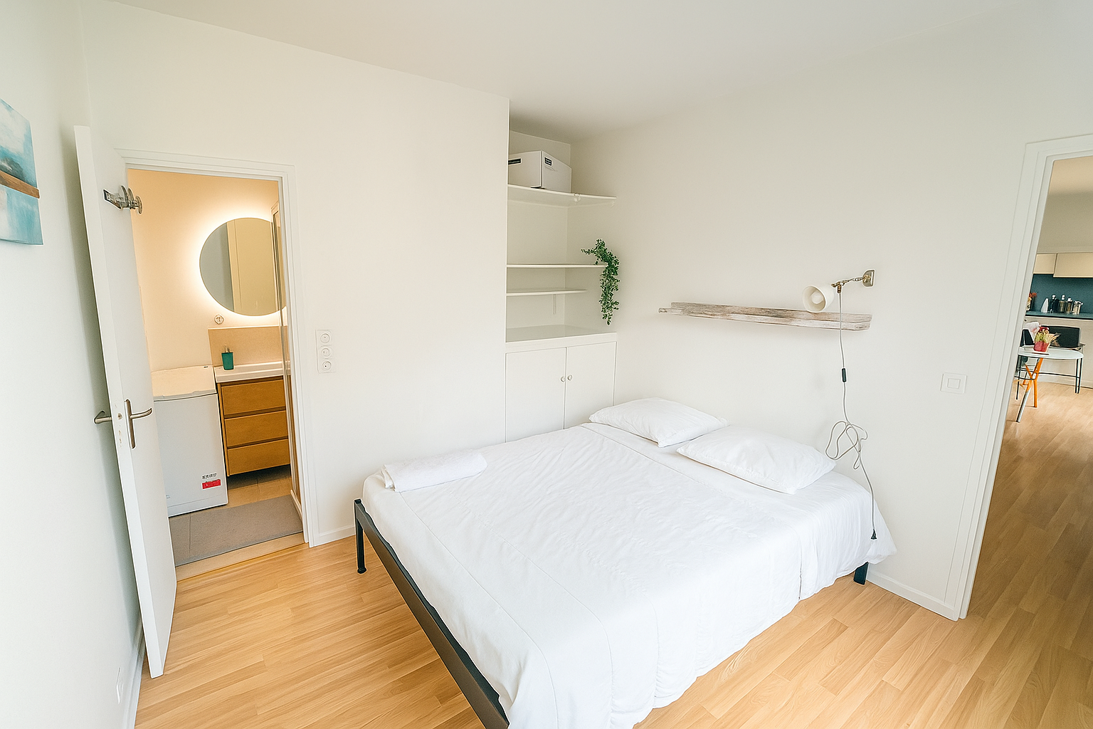 L'appartement se compose d'un séjour lumineux bénéficiant de 4 grandes fenêtres et d'une cuisine américaine entièrement équipée, d'une chambre avec rangements, d'une salle de bains avec douche et lave-linge, ainsi que de WC séparés.