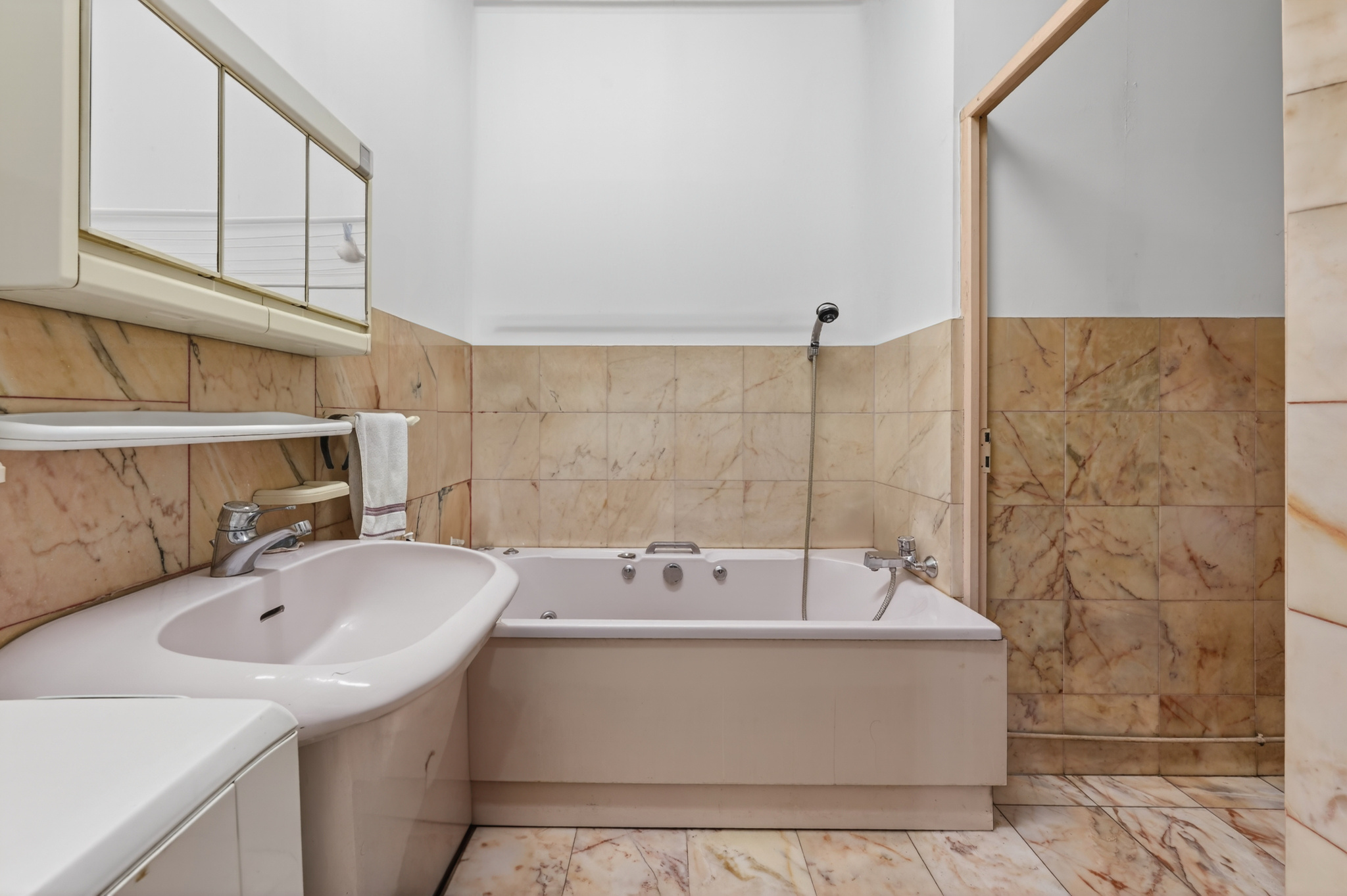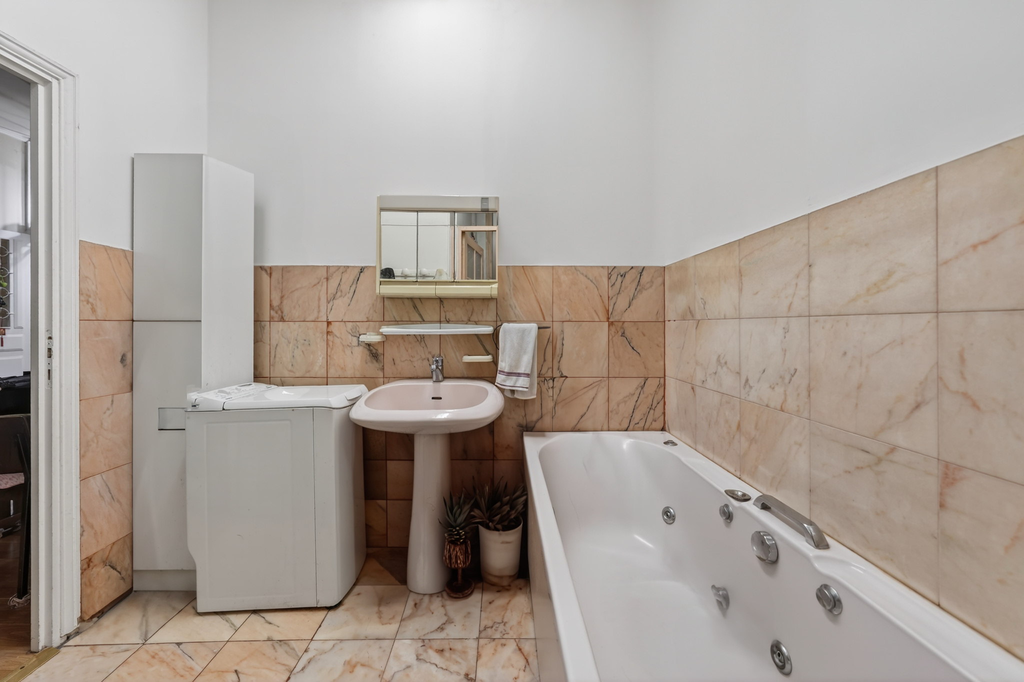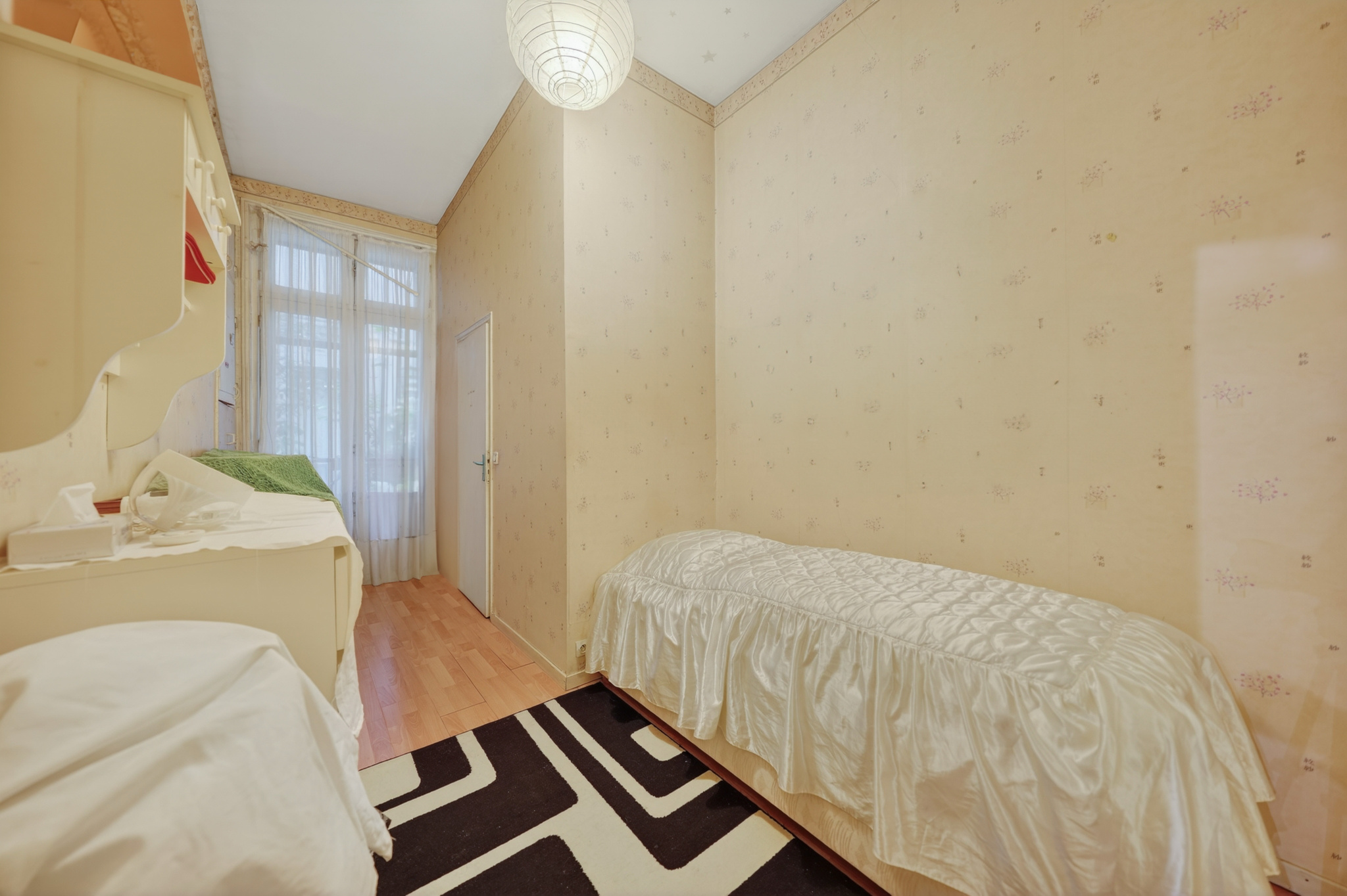 L’appartement se compose d’un salon lumineux, d’une kitchenette fonctionnelle, ainsi que de trois chambres, dont deux suites parentales, offrant intimité et confort. Les volumes sont particulièrement agréables grâce à une belle hauteur sous plafond et à une pièce de vie spacieuse.